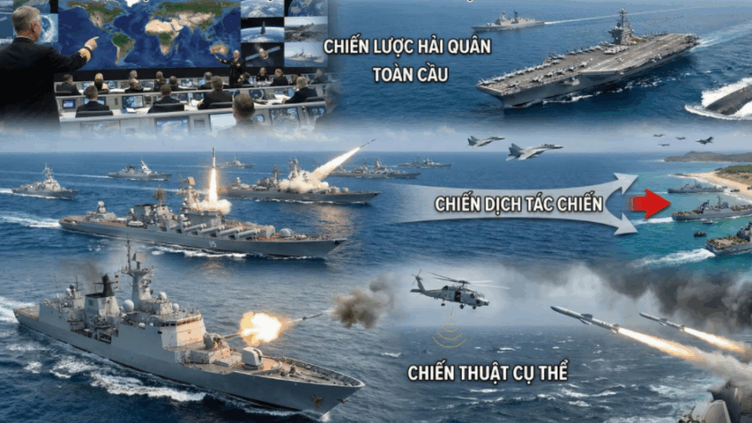 Nghiên cứu về chiến tranh, theo truyền thống Clausewitz, thường được chia thành ba cấp độ phân tích: chiến lược, chiến dịch và chiến thuật. Tuy nhiên, việc áp dụng mô hình “tam ngôi” này vào môi trường biển đòi hỏi một sự điều chỉnh tư duy sâu sắc so với tác chiến lục quân. Nếu như mặt đất là môi trường tĩnh, nơi địa hình cố định và việc chiếm đóng lãnh thổ là thước đo của chiến thắng, thì biển cả là một môi trường động (“fluid medium”), nơi không có chiến hào vĩnh cửu và quyền sở hữu chỉ mang tính thời điểm.